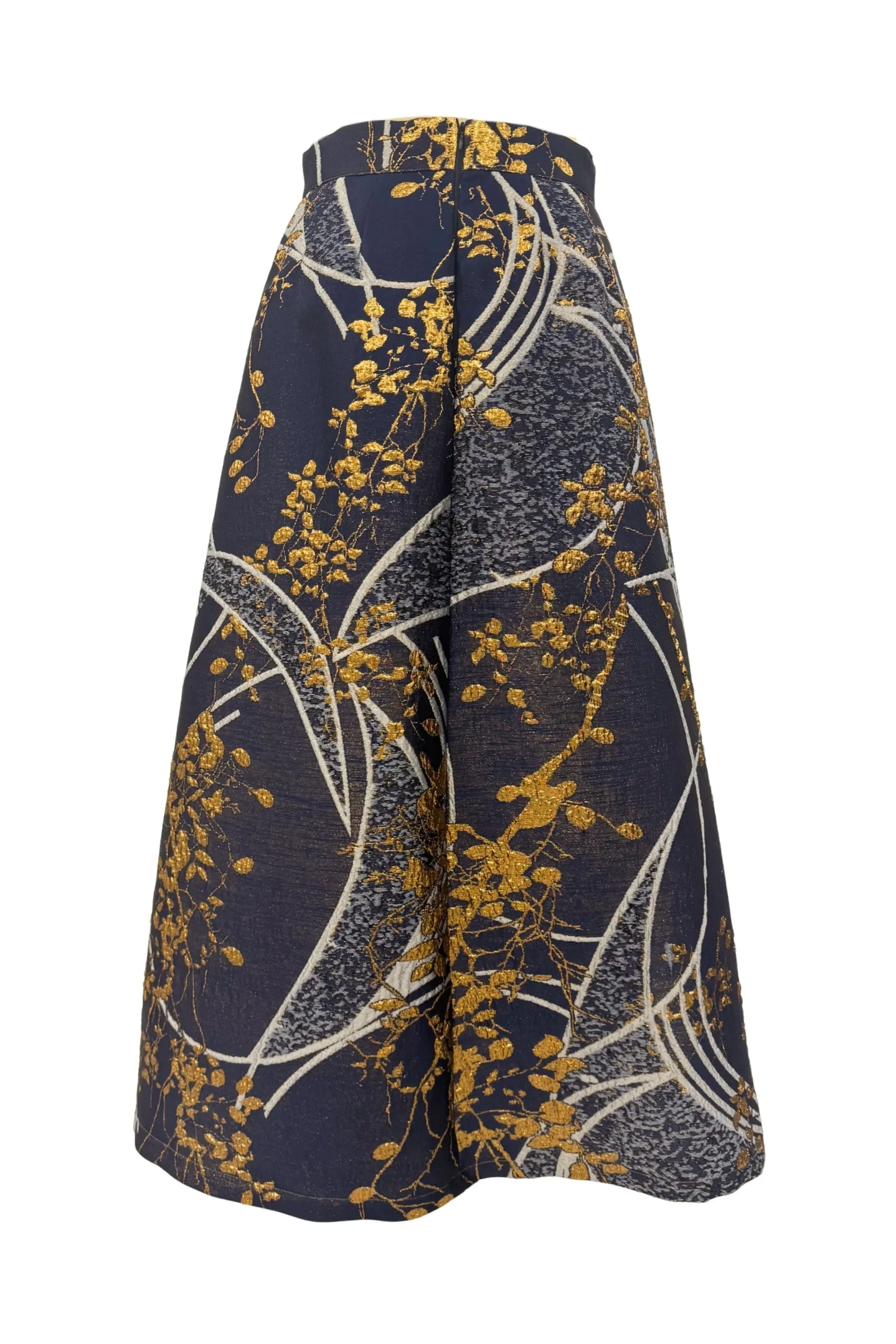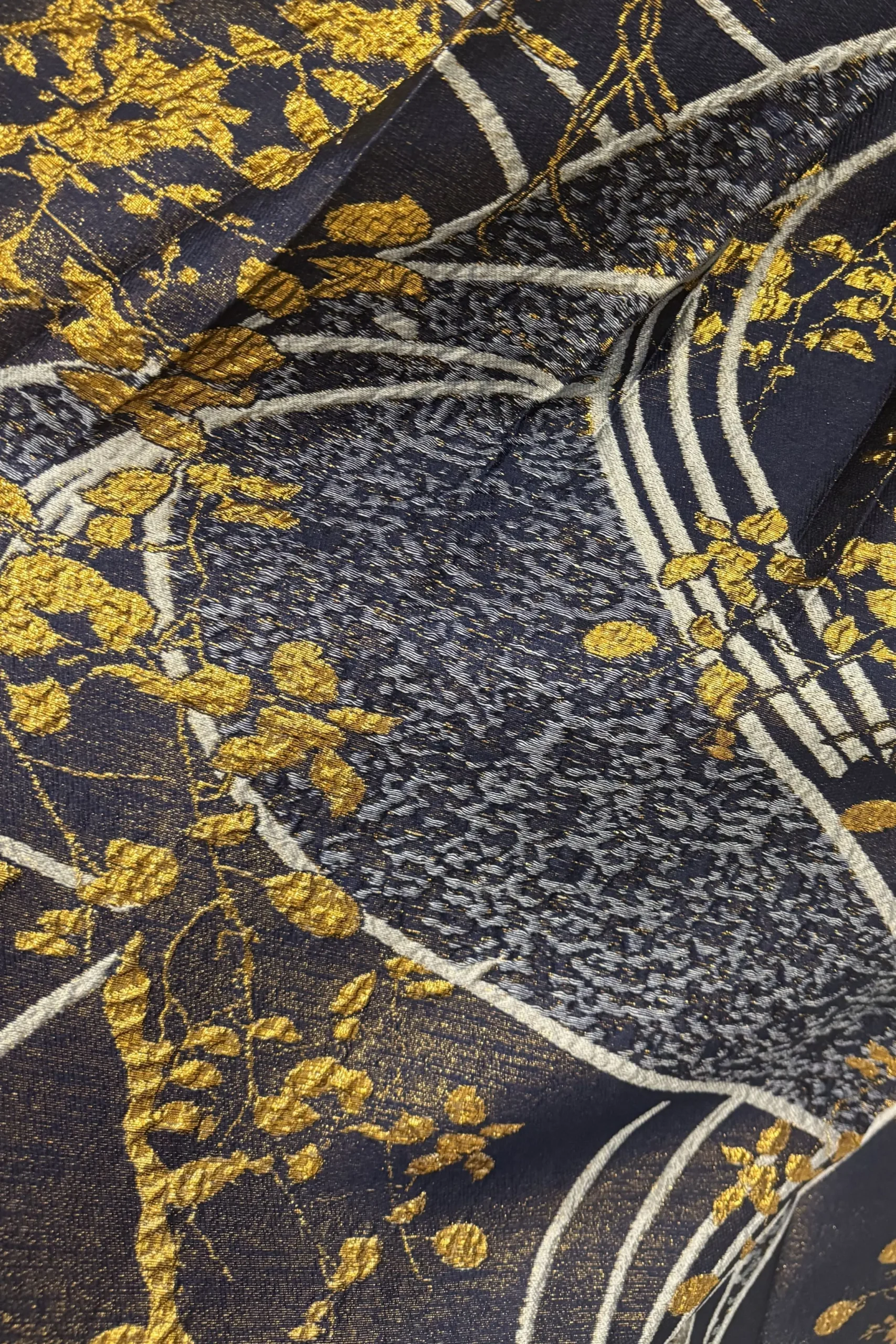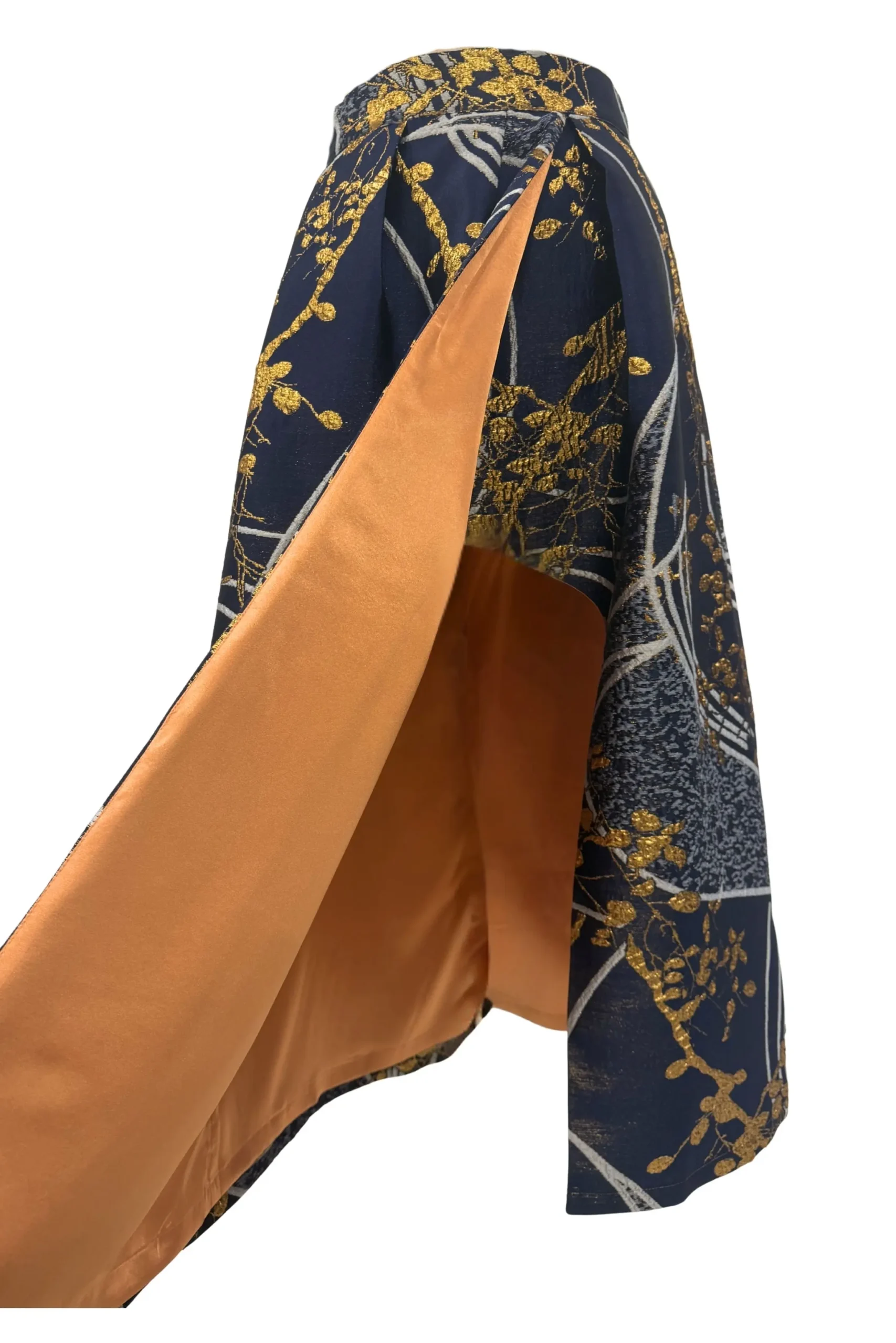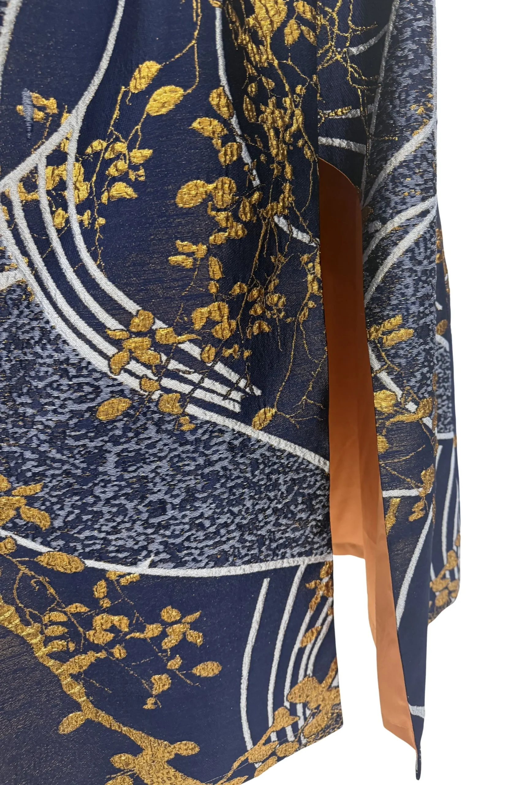 Jakarlı brokarın tok ve hacimli yapısı, formunu koruyan güçlü bir siluet oluşturur.