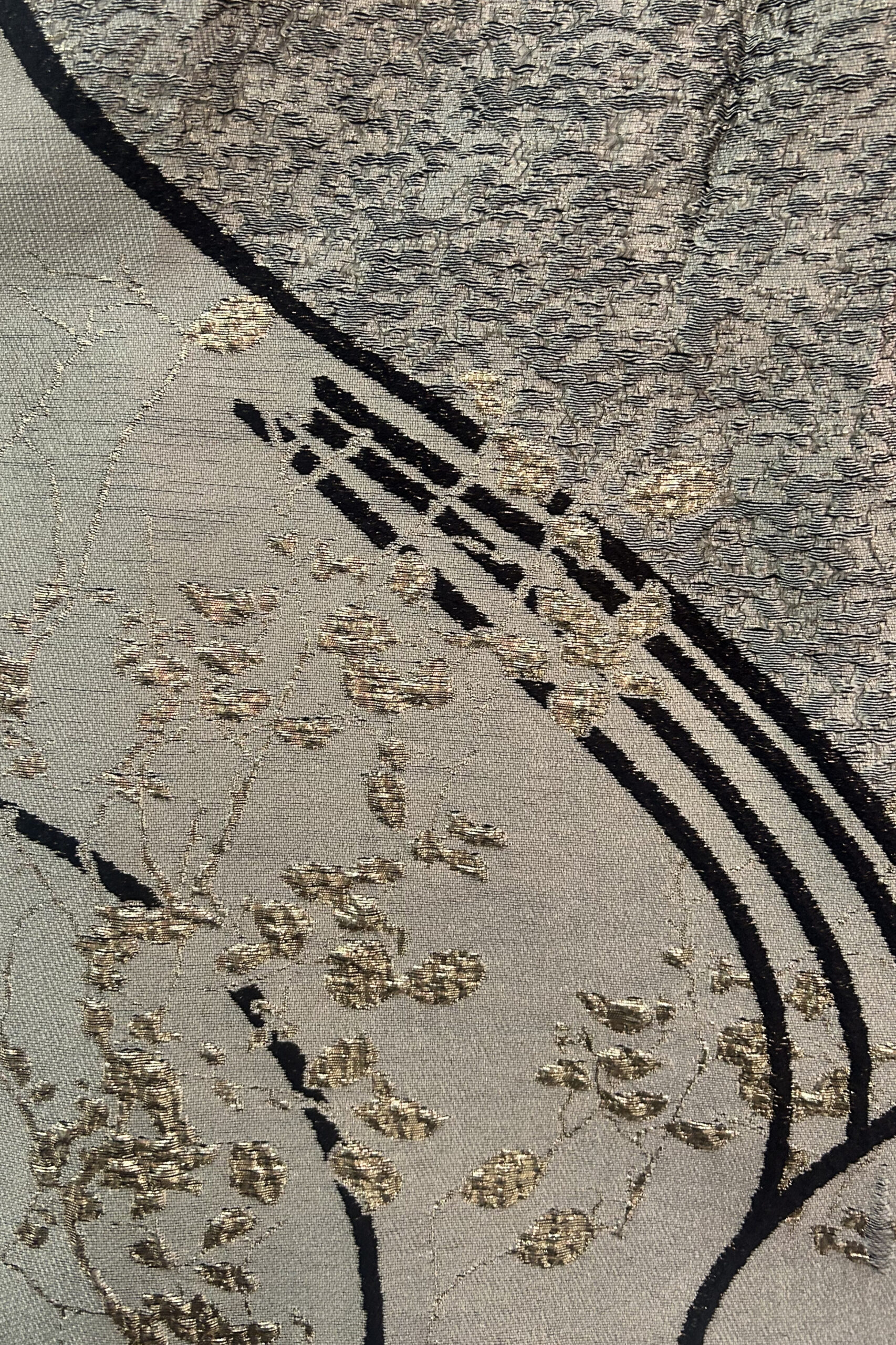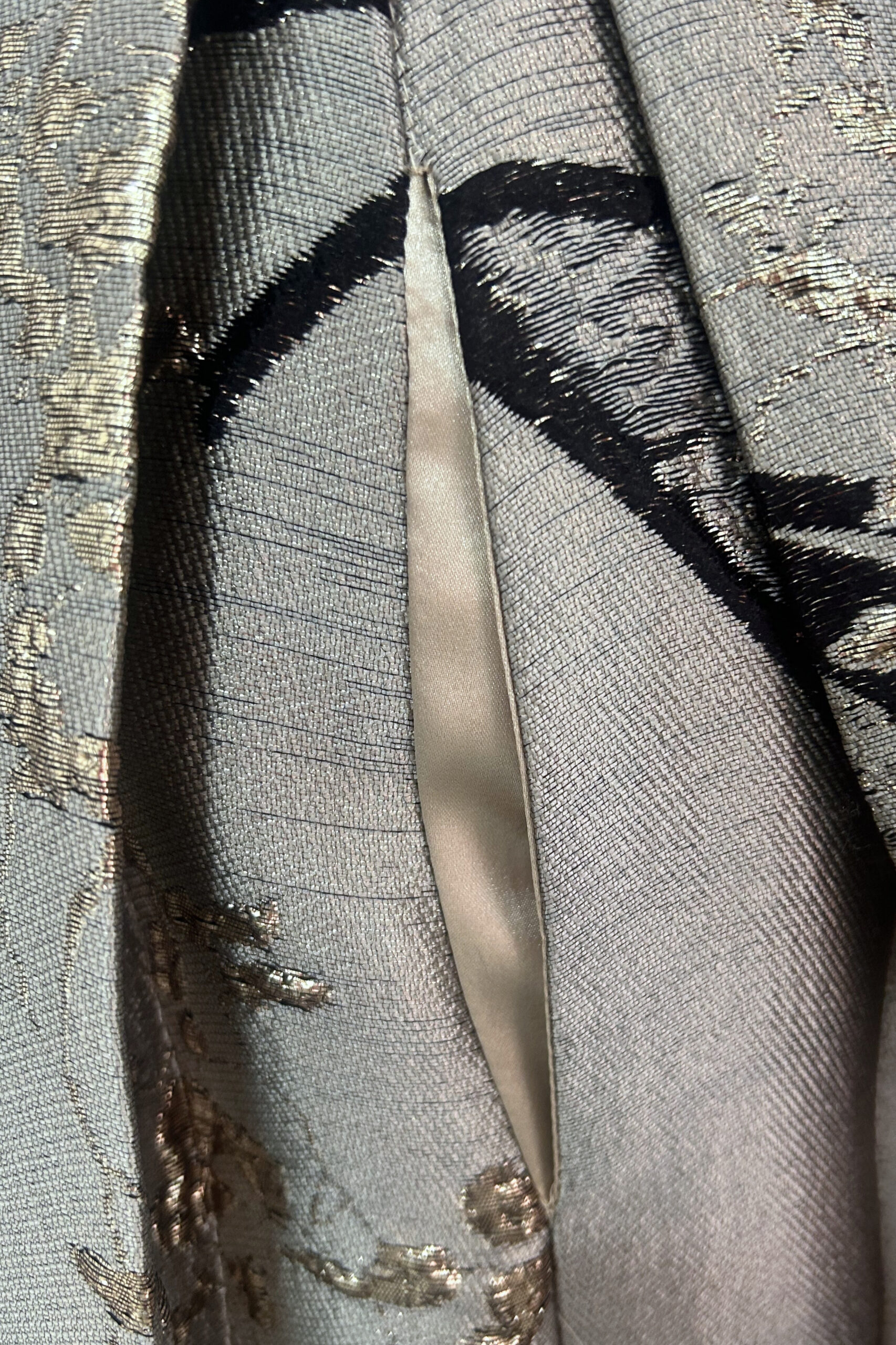 Jakarlı brokarın tok ve hacimli yapısı, formunu koruyan güçlü bir siluet oluşturur.